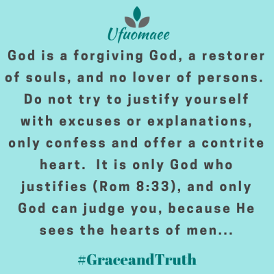 God is a forgiving God, a restorer of souls, and no lover of persons. Do not try to justify yourself with excuses or explanations, only confess and offer a contrite heart. It is only God who justifies (Rom 8:33), and only God can judge you, because He sees the hearts of men (Jer 17:9-10). I believe, by the mercies which I have received in Christ, that the same grace is available to these (believers with broken marriages) that is available for the new believer, only that more is expected from them (Luke 12:48)!! If you are one, you should be wiser now. You should be able to love more now. Think about what Jesus said about the prostitute who was forgiven much and loved much (Luke 7:47)! Like the woman caught in the act of adultery, Christ releases you from your burden of guilt, with this simple chastisement: “go, and sin no more” (John 8:11).
