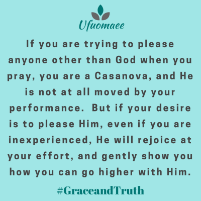 Prayer is a skill that can and must be developed, and the best teacher is God Himself! Just like the best person to teach you how to make love, is your partner! After all, he or she is the one you are trying to please. However, though it needn’t be daunting, it is true that religious people make it so, as many see it as an avenue to show off their righteousness. They are like the Casanova who thinks he is such a good lover and ‘makes love’ to satisfy his pride, whether or not his many partners are satisfied. If you are trying to please anyone other than God when you pray, you are a Casanova, and He is not at all moved by your performance. But if your desire is to please Him, even if you are inexperienced, He will rejoice at your effort, and gently show you how you can go higher with Him.