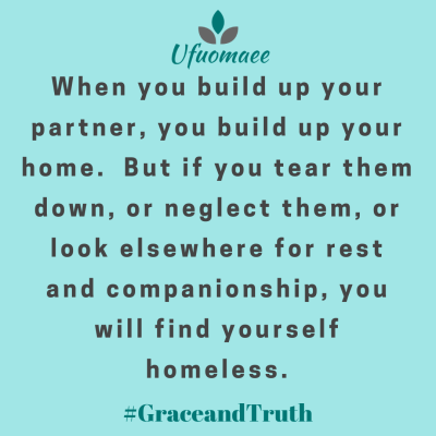 It is your responsibility to make your home what it ought to be.  Don’t settle on building and decorating a house, for appearances’ sake.  The home is made up of those who share it, who dwell in it, who rest in it and who are nourished by it.  When you build up your partner, you build up your home.  But if you tear them down, or neglect them, or look elsewhere for rest and companionship, you will find yourself homeless.  Your marriage will be no more than a house, a prison of sorts…a miserable abode.