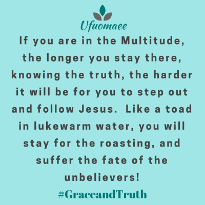 So, the real question I would like you to think about, answer to yourself and God, and DO SOMETHING ABOUT, is “are you in the Multitude?” If you are in the Multitude, the longer you stay there, knowing the truth, the harder it will be for you to step out and follow Jesus. Like a toad in lukewarm water, you will stay for the roasting, and suffer the fate of the unbelievers! Sure, you will enjoy His wisdom, and receiving physical healing by faith…you may do great things in His name and prosper in the world…but at the end of time, Christ will tell you to your face that He never knew you (Matt 7:22-23)! Don’t be a fan, be a follower!