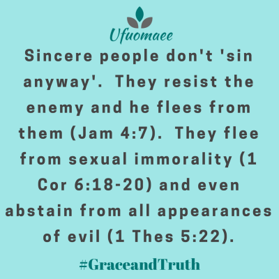 Those who are insincere will use the fact that everyone is prone to sin as a justification to keep doing what they know is wrong. Sincere people don’t ‘sin anyway’. They resist the enemy and he flees from them (Jam 4:7). They flee from sexual immorality (1 Cor 6:18-20) and even abstain from all appearances of evil (1 Thes 5:22).