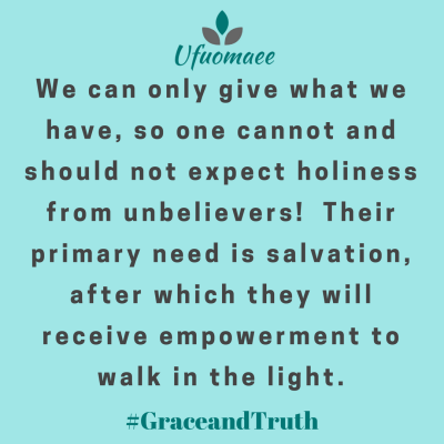However, we know that the carnal mind cannot comprehend the things of the Spirit, nor can it be subjected to it (Rom 8:7-8, 1 Cor 2:14). We can only give what we have, so one cannot and should not expect holiness from unbelievers! Their primary need is salvation, after which they will receive empowerment to walk in the light.