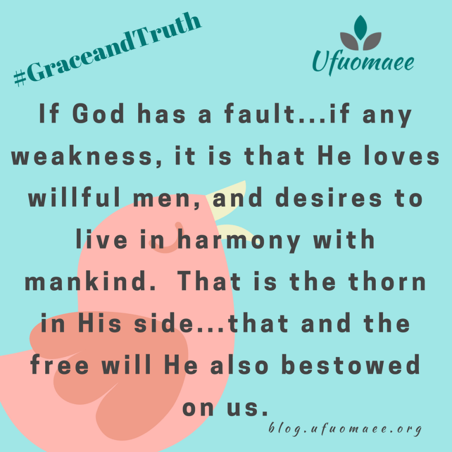 If God has a fault…if any weakness, it is that He loves willful men, and desires to live in harmony with mankind. That is the thorn in His side…that and the free will He also bestowed on us. And so, for the joy of fellowship with Man forever, Jesus Christ endured the Cross (Heb 12:2)!