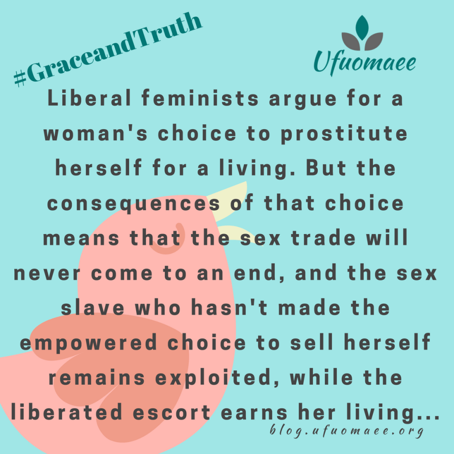 It isn’t all that clear cut is it? Liberal feminists argue for a woman’s choice to prostitute herself for a living. But the consequences of that choice means that the sex trade will never come to an end, and the sex slave who hasn’t made the empowered choice to sell herself remains exploited, while the liberated escort earns her living…