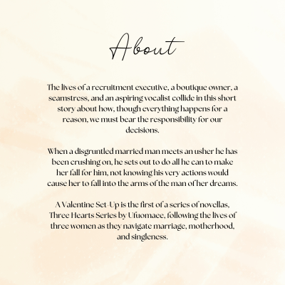 A Valentine Set-Up, which is now available on Kindle Unlimited, is a story about how, though everything happens for a reason, we must bear the responsibility for our decisions. We see Remi, a single lady, pursued by a married man, deal with the hard choice of being alone or compromising and living an easier life. We are also introduced to the two other women, Tinuke and Bidemi, who are dealing with different challenges in their love lives.