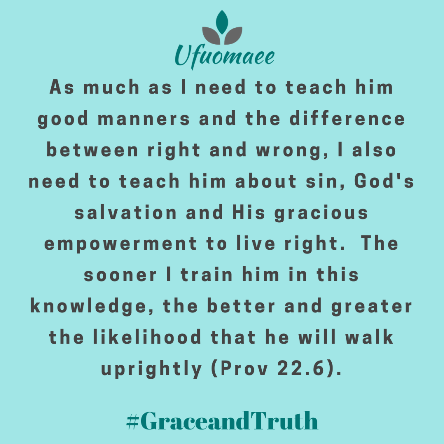 So, while I ought to take responsibility for my role of a parent in Jason’s life, I can’t take responsibility for his salvation. I can’t deny that he needs Jesus to be good, the same as me. As much as I need to teach him good manners and the difference between right and wrong, I also need to teach him about sin, God’s salvation and His gracious empowerment to live right. The sooner I train him in this knowledge, the better and greater the likelihood that he will walk uprightly (Prov 22.6).